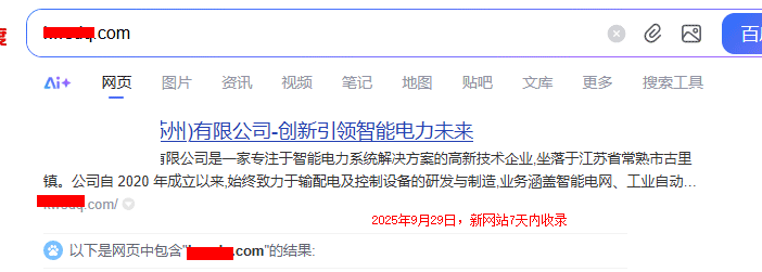 2025年9月29日,新網站7天內,百度首頁收錄。