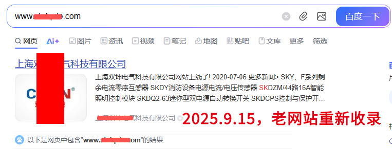 2025年9月15日,老網(wǎng)站收錄消失,網(wǎng)站被降權(quán),首頁(yè)收錄消失,老網(wǎng)站首頁(yè)重新收錄。
