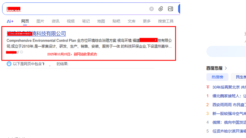 2025年10月15日,福建**環(huán)境科技公司新網(wǎng)站百度收錄